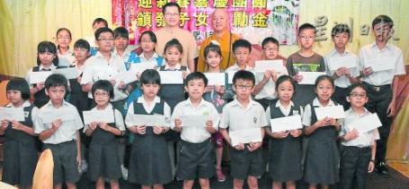 小学组学业优良奖励金获奖者与颁奖人兼甲居士林林长王书优(后排左起)及禅亮法师合影。