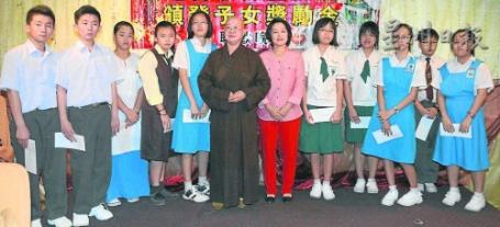 荣获初中组学业奖励金的学生与颁奖人黄妙霞(右六起)及理慧法师合影。