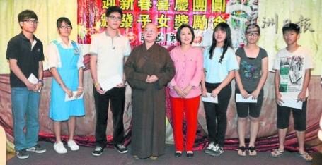 高中组获奖者与颁奖人理慧法师(左四起)及黄妙霞合影。