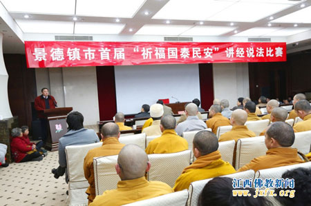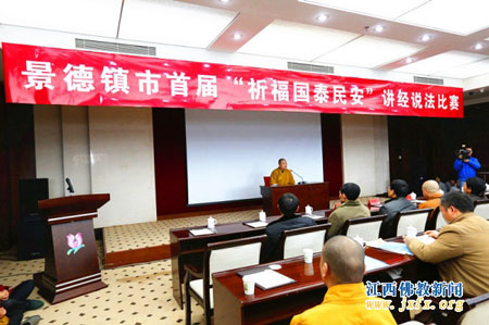 2014年1月17日上午10时,江西省景德镇市佛教界首届“祈福国泰民安”佛教界讲经说法大赛决赛在景德镇市紫晶宾馆1号会议室隆重举行。省民宗局、省佛教协会和景德镇市委、市政府以及市委统战部、民宗局十分重视此次比赛,中国佛教协会副会长、省政协民族和宗教委员会副主任、省佛教协会会长纯一法师亲临会场,省佛教协会常务副秘书长觉海法师致贺词,市人大副主任余乐明,市人民政府副市长张春萍,市委统战部副部长石珂,市人大民族宗教外事专委会主任刘光照,市政协法制民族宗教专委会主任杨普震,市民族宗教事务局局长陈新平,副局长万景彪、徐文生,和省民宗局有关处室干部应邀出席指导比赛。为提高本次大赛的水平和公众关注度,景德镇市民宗局邀请了省民宗局、省佛协有关领导和法师作为大赛评委,并组织了广大信众和热心人士近四百人观看了比赛。