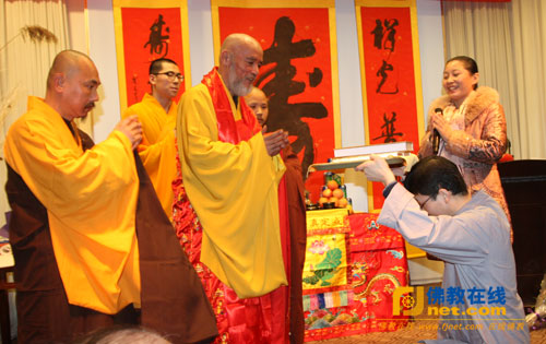 福慧慈缘总经理童凤英代表佛教在线总干事安虎生及所有员工供养本渡长老一套《中华佛教文化年鉴》