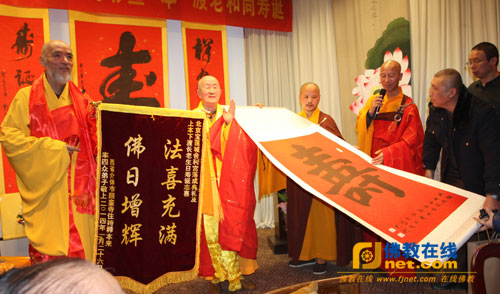 此次本渡长老生日寿诞盛典由觉圣法师主持。寿诞中,著名书法家胡功臣为本渡长老赠送墨宝,是特别为本渡长老寿诞书写墨宝寿字作品一幅,以祈愿长老无量寿,无量光,德行圆满,普度众生。接着,本渡长老与嘉宾共同为宝莲城舍利宫落成、诸佛舍利安座进行剪彩。本渡长老的德行感召了十方诸佛菩萨的加持,使诸佛、菩萨及诸大弟子的尊圣舍利得以在北京宝莲城舍利宫安奉供养,愿佛日增辉、佛光普照、国泰民安、风调雨顺。愿在座大众免难消灾,心想事成。