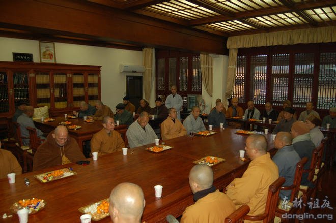 上午8时30分,茶话会正式开始。参会的诸位比丘师父围桌而坐。会议桌上摆上了茶果,茶话会充满了喜悦与祥和。在本通法师的主持下,东林寺以及净土苑各个主要堂口和部门的比丘师父相继对自己所负责的工作做了简短汇报,并祝各位新年吉祥,道业增上。