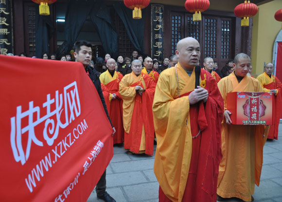 兴化禅寺与快哉网联合举办了万名网友马年祈福活动,受到广大网友的追捧。截至2月5日上午9点,已有7600多名网友登录快哉网为自己或亲友送上祝福。工作人员下载了网友的心愿和祝福语,用红纸统一打印后封存到祈福箱内。在30日上午 9点,快哉网工作人员在云龙山东门内,把祈福箱郑重移交到兴化禅寺卧佛殿,兴化禅寺方丈果光大和尚率众弟子在东山门接过祈福箱。