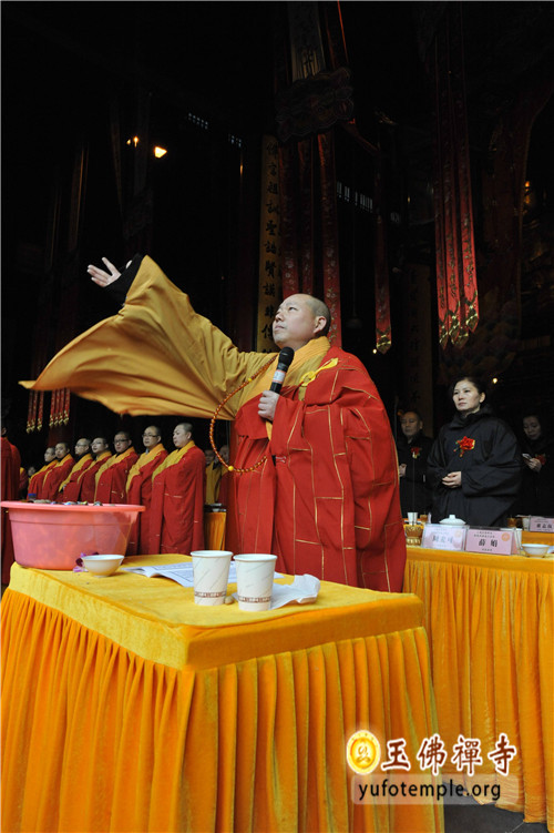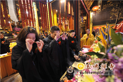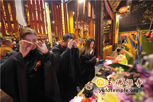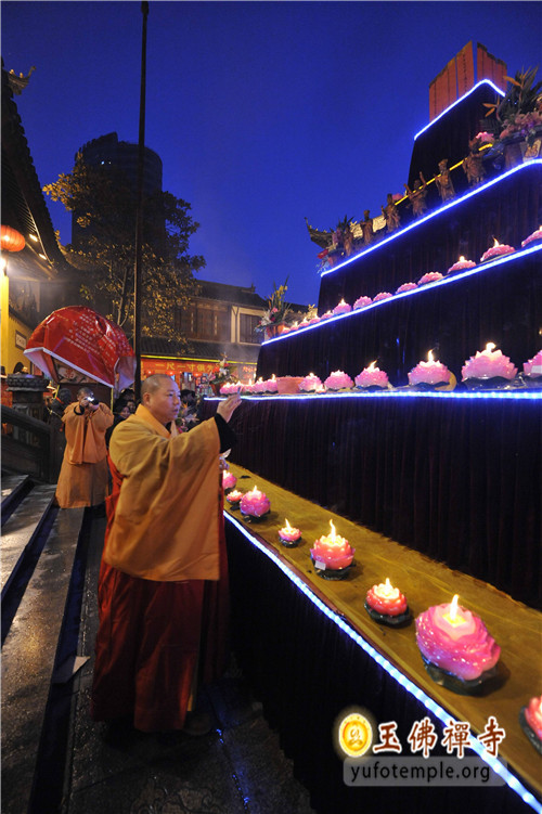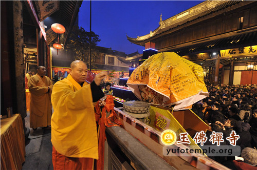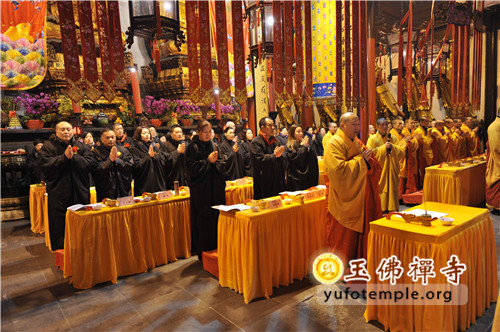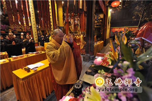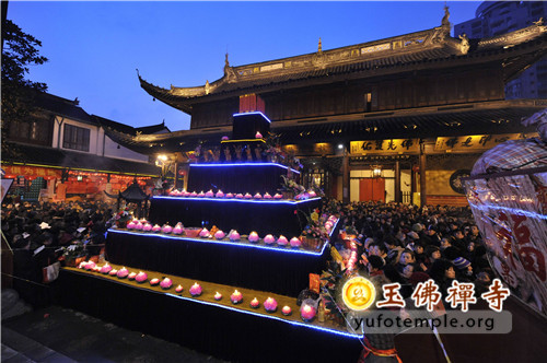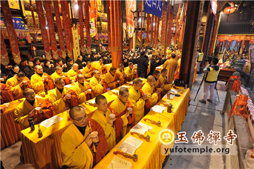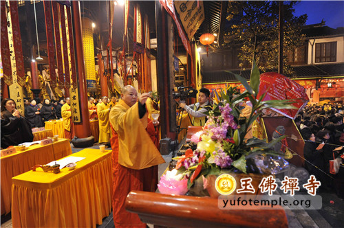 2014年2月8日(农历正月初九)清晨, 上海玉佛禅寺“甲午新春供佛斋天祈福大法会”在寺内大雄宝殿举行。前院丹墀中央,供台高立,供品齐全,数千信众齐聚大雄宝殿前,场面庄严、清净而隆重。