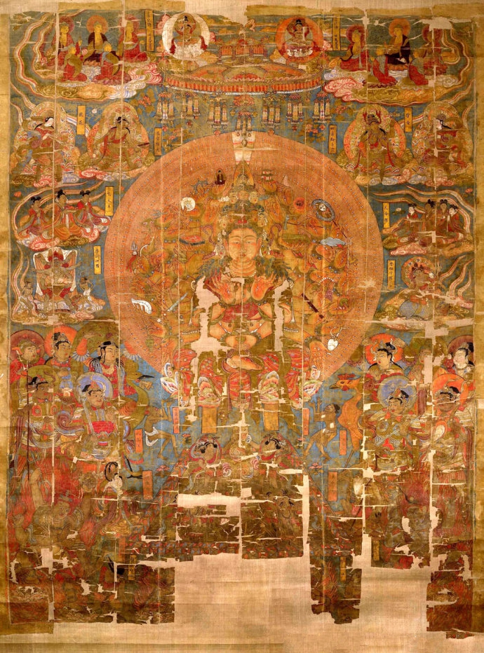 此幅给人留下深刻印象的绘画,Waley把它当作收集品中最精美的作品之一,松本荣一博士则认为它是吐蕃时期密教在敦煌地区盛行时密教佛画的代表作。密教的影响,已出现在与该绘画大小相同的药师净土变相图中,那图的上边两角安置有千手观音和文殊菩萨。千手千眼观音在其它大型的药师净土图中是也作为主要像出现的。在有相当于836年的“丙辰”纪年的题记里,与如意轮观音一起被提到。从这些观音的流行和密教的普及上看,可以肯定不论是壁画、绢绘,还是其他载体,都盛行这样的图像表现方式。诸如斯坦因收集品中,有绘在麻布上的千手千眼观音像,此图中绘有身穿9世纪初至中叶时期衣裳的供养人像,与这幅大的多的绢画极为相似。尽管那图远远小于该绘画,但画面的安排方式几乎是一样的。集美博物馆所藏有981年纪年的作品中央的千手千眼观音被绘成立像,周边绘由许多与他相同姿势的小像。此外,新德里国立博物馆也有几幅类似的作品。