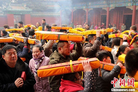 2014年2月14日,农历正月十五元宵节,中国北方最大的藏传佛教圣地河北省承德普宁寺全体僧众举行新春祈愿法会。伴随着浑厚的法号声,普宁寺僧侣们开始举行“转寺”仪式,众僧围绕普宁寺顺时针转一圈。僧众们通过敲钟、转寺、诵经、点酥油灯等方式祈福。(图:张帆)
