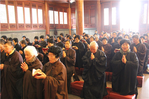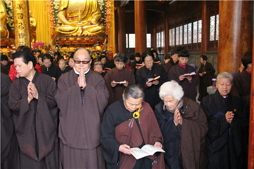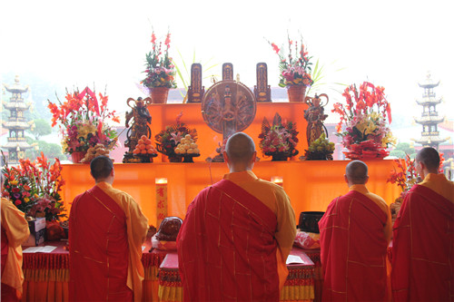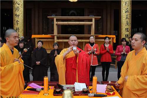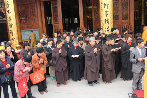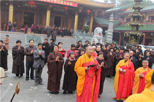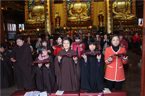 放生法会现场四众弟子云集,众法师唱念杨枝净瓶,加持甘露法水,令彼含灵,皆得洒沾,身心清净,堪闻妙法。主法法师手执净瓶绕众生灵尽洒净瓶甘露,并为待放生生灵诵经持咒,做三皈依,称念佛名,惟愿其等早日离苦得乐,永脱网捕吞杀之难。