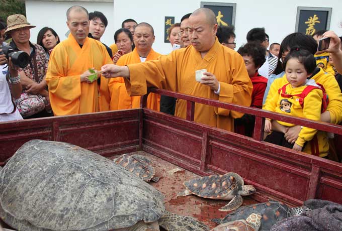 2014年2月22日,三亚南山寺举行马年新春放生祈福法会。中国佛教协会副会长、海南省佛教协会会长、本寺方丈印顺大和尚亲临主法,祈愿天下国泰民安、风调雨顺。参加此次法会的有十多名法师念佛、诵经、洒净、皈依、回向,庄严肃穆的法会过后,便将海龟放归大海。放生有十大功德:一曰无刀兵劫;二曰集诸吉祥;三曰长寿健康;四曰多子宜男;五曰诸佛欢喜;六曰物类感恩;七曰无诸灾难;八曰得生天上;九曰诸恶消灭,四季安宁;十曰生生息息,永享福寿。