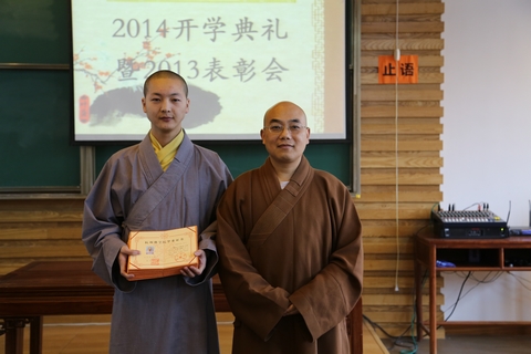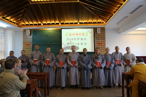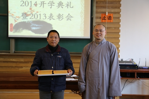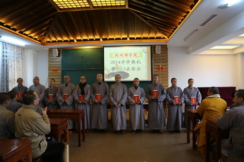 其后,刚晓法师宣布了法净修持奖、永福闻思奖、毕业生优秀论文奖以及2013优秀教师的名单。中天竺法净禅寺乘达法师为法净修持奖获奖者颁发了荣誉证书与作品。获得本年度法净修持奖的有:通奕师、圆明师、宗敬师、融成师、妙行师、法成师、慧法师、正修师、果顺师、安谛师。永福寺通迪法师为永福闻思奖获奖者颁发了荣誉证书与奖品。获得本年度永福闻思奖的有:慧光师、慧明师(女)、妙旭师、门芝师、宽通师、慧明师、悟诚师、继道师、能诚师、圣一师。杭州佛学院副院长慧仁法师为毕业生优秀论文获奖者颁发了荣誉证书与奖品。获得优秀论文奖的有:宗燃师,源兴师。杭州佛学院院长助理兼办公室主任纪佩珍老师为获得优秀教师的老师颁发了荣誉证书与奖品。获得优秀教师奖的有:王心喜老师、徐国珍老师。