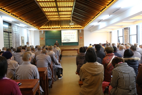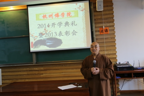 2月24日上午,在杭州佛学院法云校区举行了杭州佛学院2014开学典礼暨2013表彰会。出席会议的有:我院副院长刚晓法师、慧仁法师;院长助理兼办公室主任纪佩珍老师以及我院教理院、艺术院、青年学佛班、女众部的师生,共计150余人。中天竺法净禅寺乘达法师与永福禅寺通迪法师也出席了会议。刚晓法师主持会议并作开示。