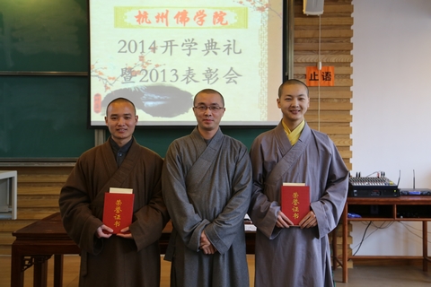 最后,杭州佛学院副院长刚晓法师为2013届本科毕业生颁发了毕业证书。杭州佛学院青年学佛班班主任照贤法师为2013届结业学员颁发了结业证书。