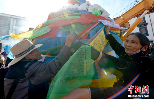 当日上午,两位常年负责更换经幡的大昭寺工作人员,在信众注视下,乘着吊车、带着50条长约20米的五彩经幡以及五颜六色的哈达升至每一根高约20米的经杆顶端,随后娴熟地将褪色的旧经幡和哈达取下,挂上了新的经幡、哈达。