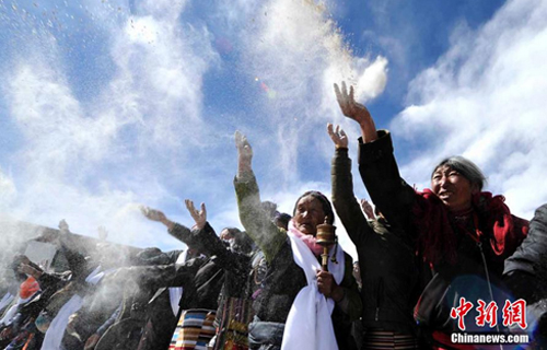信教民众向天空抛洒糌粑 庆贺经幡更换结束