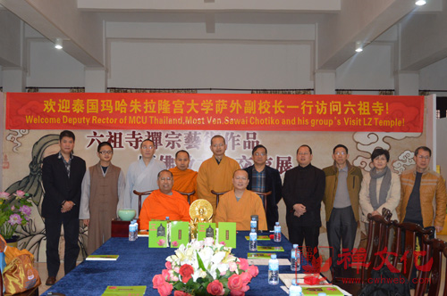 接着萨外副校长说当翻译《六祖坛经》的时候也了解了一些大传佛教,发现南传佛教的禅修和书中所讲内容很相近,然后副校长说三年前玛哈朱拉隆宫大学就与六祖寺有合作项目到现在做泰文版的《六祖坛经》,希望今后有更多的活动合作。六祖寺在大愿法师的领导下,在传播佛法方面做出了很大的贡献,《六祖坛经》中六祖慧能大师的教导,在六祖寺得到践行,比如教育、禅修、佛教书籍的出版,以及社会方面六祖寺都做了很多活动。然后萨外副校长表示只要我们坚持六祖慧能大师传下来的知识,然后再加上我们的努力合作就一定能取得更好的成就。把六祖慧能大师的智慧付诸到实际当中,第一是通过书籍的形式;第二是互联网;第三是融入到生活当中。萨外副校长表示此次来访六祖寺所学到的东西,回到玛哈朱拉隆宫大学会告诉学生,这里在大愿法师的领导下把六祖大师的教导执行的非常好。萨外副校长表示在翻译《六祖坛经》过程中感觉到慧能大师的教导对学佛人有很大的帮助和指导,现在这本书对玛哈朱拉隆宫大学那里的25000名学生也有很大的指导意义,学生通过学习这本书可以把里面的教导运用到他们的生活中然后再传播给别人。最后萨外副校长表示今后会继续出版这本书。