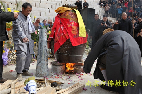 追思法会后在宏觉寺佛光塔举行了荼毗法会,由南京市佛教协会顾问全乘长老主法并举火。