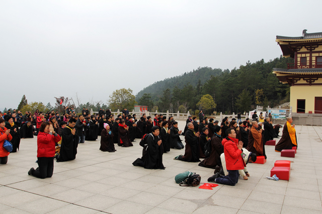 永智法师一行人从信愿路三步一拜至拜佛台,并于东林大佛前虔诚发愿,祈愿往生净土,也祈求佛力加持,使白象古寺的重建复兴能一切顺利。