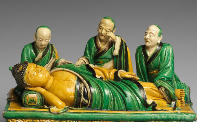 此为美国大都会博物馆所藏大明弘治素三彩《佛陀涅槃及弟子群雕像》,此像由一件群雕像和五件单体人物雕瓷像组成雕塑群,采用名贵的素三彩雕瓷再现了二千五百多年前佛陀涅槃时的场景,十分稀有珍贵。佛陀涅槃时,十大弟子中舍利弗尊者和目犍连尊者已经去世,佛陀身边实有八大弟子(大迦叶尊者尚在赶来途中)。吉祥卧中的佛陀,身金黄色,面容圆润饱满,神态宁静安详。八大弟子或坐或跪或立,神态虔诚悲戚。捶胸顿足,抹泪悲泣,神态各异,此素三彩人物雕瓷准确的再现了佛陀涅槃时弟子们悲痛欲绝的场面。