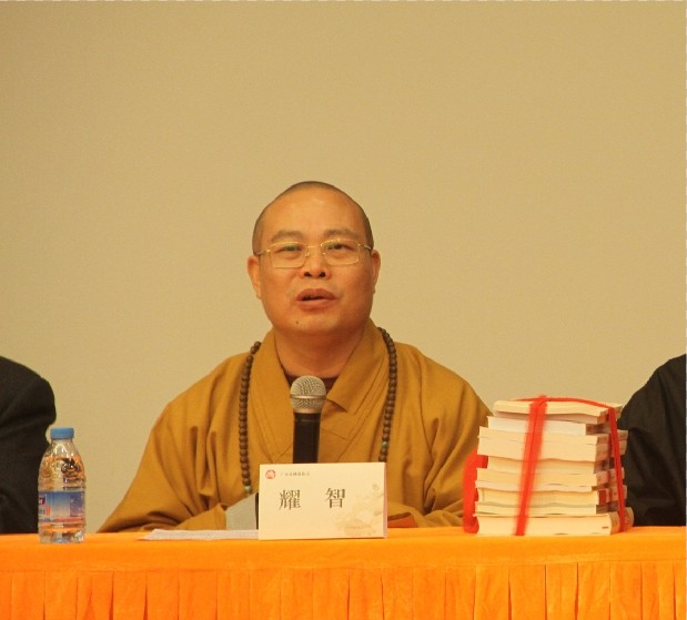 入学典礼由耀智大和尚主持。首先由广东佛学院明生大和尚致辞。明生大和尚介绍了广东佛教的悠久历史,经历了佛法的初传、经典的翻译、义理的诠释、宗派的建立的过程,并介绍了近代广东佛教教育所经历的产生和发展的过程、广东佛教学院式僧伽教育的起源和变迁,对岭东佛学院、云门佛学院、广东尼众佛学院、曹溪佛学院的办学作了回顾。这些佛学院为培育佛教的后继接班人、兴隆三宝作出了不可磨灭的贡献,成绩斐然。为巩固四所佛学院的办学成果,整合四所佛学院的办学资源,升格佛学院的级别与内涵,国家宗教事务局于2011年7月批准广东省佛教协会和四所佛学院共同成立广东佛学院,总部设在广东省佛教协会所在地广州光孝寺。为推动四所佛学院,办出新的成果,广东佛学院采取将本部与社会大学合办,将佛学课程与社会课程同步进修的方式,培养复合型的人才,帮助在校的学僧、教师以及有高中文化的寺院僧众获得本院和社会大学的双重学历,使他们既能掌握佛学理论知识,又能打通与社会沟通的渠道,并促使他们考研深造或进一步出国留学,更契理契机地弘法利生,成就自利利他的无上因缘,为佛教事业做出自己的贡献,也为佛教界培养一批优秀的后备人才。