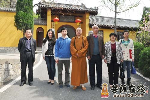 江苏省佛教协会副会长、徐州市佛教协会会长、兴化禅寺方丈果光大和尚(左四)热情接待江苏省民族宗教研究会会长沈祖荣(右三)一行
