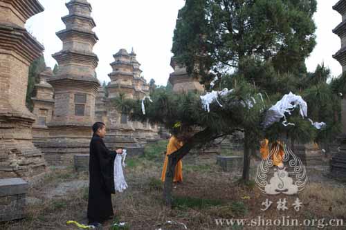 在祖师塔旁的松柏树上,少林僧人挂起用白纸剪成的纸串,以示少林宗门后继有人、兴旺发达。祖师塔下,永信方丈亲自主法,寺院僧众诵经上供,并焚烧用金银箔叠成的元宝,以祭奠历代祖师大德。在庄严的梵呗声中,大家一起祈愿世界和平安宁,众生身心自在,佛教正法久住。