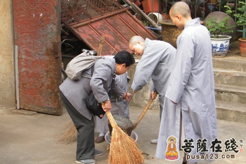前来礼塔的法师居士齐心协力将太虚塔、潮音茅蓬清扫干净,将素雅的鲜花与新鲜的瓜果供养大师。在茅蓬内外诵经供养诸佛菩萨与大师,排班称念“南无当来下生弥勒佛”,绕塔三匝,并礼拜舍利塔,表达对大师不辞佝劳弘法利生并创建武昌佛学院恩德的感念!