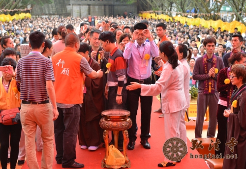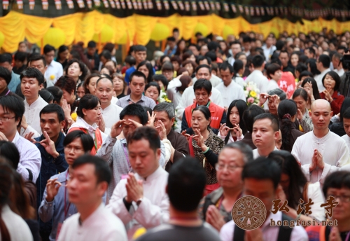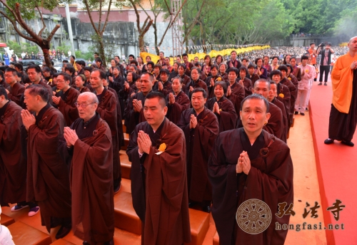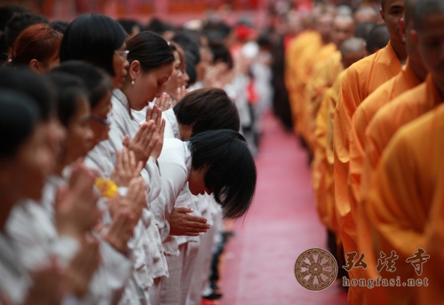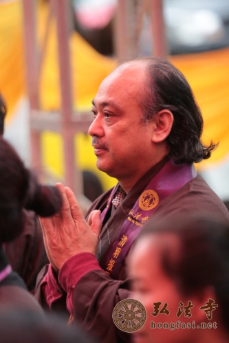 每年清明,若不下雨,似乎就不是清明,就没有了清明所特有的韵味。去年今月今日,在纪念本焕长老一周年之际,弘法寺启建2013年清明思亲报恩水陆法会开坛普佛盛会之时,天降甘露,倾盘大雨一泻而下,让现场大众身心清凉。朗朗的经声、佛号声伴随着清明的雷音雨声,响彻一方净土,令人犹如置身极乐佛国。逝去的亲人,数不清的慈恩,千重山万重水的魂牵梦萦 ,都一一化作虔诚祈愿,台上的法师们及唱诵团的居士坚持站立雨中诵经拜忏,雾气和着炉香青烟袅袅升腾,现场神圣庄严、震慑人心。台下上千信众在雨中呼应,法会殊胜圆满。
