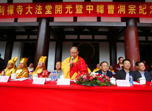 纯一法师在讲话中指出:“此次中韩两国佛子在这里再次聚首,隆重纪念良价祖师,对于深切缅怀良价祖师的无量功德,学习领会祖师的深邃思想,继承祖师的朴实家风,深化两国佛子的法情道谊,开创新的历史局面,有着很好的现实意义与深远的历史意义!让我们共同努力,把普利寺打造成为重振曹洞宗风的根本丛林,成为国际曹洞宗弟子的精神家园,成为江西旅游的新亮点,成为大众休闲养生的好去处。衷心地希望,普利寺在古道法师的率领下,进一步遵照佛制戒律、祖制清规,依法依有序开展好各项法务活动,加强道风建设,重振宗风,为早日实现祖庭圆满重光,持之以恒,发大菩提,放大光明,为江西佛教事业发展的远大目标做出应有的贡献。“?韩国曹洞宗总务院长德牛长老在致感谢词时说:在这春意盎然、花香袭人的季节,为了增进韩中佛教的友好关系,在此举办洞山普利寺法堂竣工仪式暨三尊佛像开光法会。首先,感谢诸位领导对于韩国佛教曹洞宗的帮助,感谢给予我们机会表达对于良价尊者的供茶祭!感谢我们的老朋友纯一法师和普利寺古道法师的成全,我们非常珍惜今日因缘,传递幸福感恩之心。让我们共同努力,把佛陀的真谛弘扬到世界,让世人充满幸福美满!”