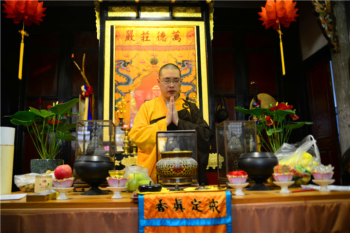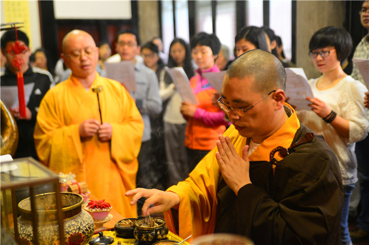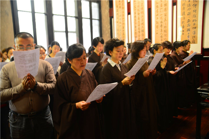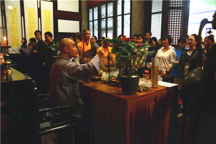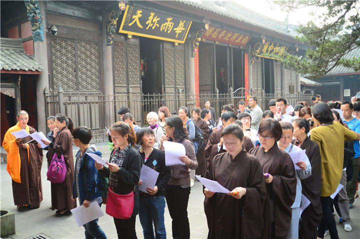 成都文殊院青年佛学会自2012年恢复学习以来,已陆续开设六个班级,按闻熏、闻思、如理的次第应机施教。为了响应学员们要求深入学修的心愿,由青年佛学会发起,弘法利生部组织,于4月13日早上8时举行了殊胜的传授八关斋戒仪式。文殊院方丈宗性大和尚做了简短开示,弘法利生部总干事庆妙法师为学员传戒,近100名学员参加。