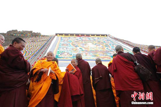 据介绍,晒出的大佛为巨型堆绣唐卡,高70米,宽50米,由青海省著名工艺大师宗者拉杰策划,先后组织90多名工匠,费时近一年绘制完成。唐卡主体绘有30尊庄严肃穆的大佛,其下工整地誊写着2000多名玉树“4·14”地震罹难者名单。