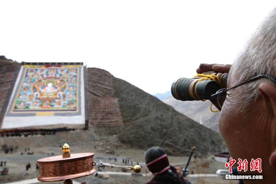 2014年4月14日,青海省玉树县结古镇当卡寺举行晒佛大会,缅怀4年前在地震中遇难的2000多名民众,并为生者祈福。