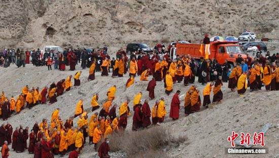 来自玉树藏传佛教寺院的僧尼正在前往晒佛台(图:胡贵龙 中新社)