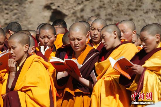 来自玉树藏传佛教寺院的僧尼正在念经(图:胡贵龙 中新社)