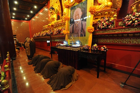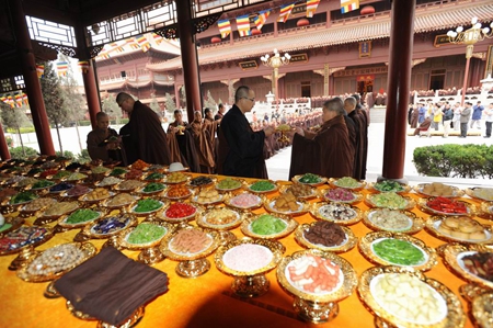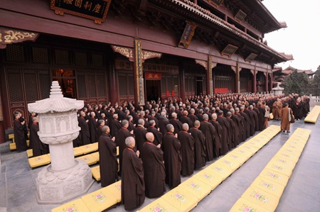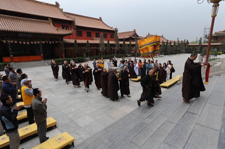 上午八点整,万佛楼前钟鼓齐鸣,柏林禅寺班首执事及净慧长老接法弟子将长老灵骨舍利迎请到万佛楼安放。九点,庄严的传供仪式开始,数百佛子在万佛楼前排成两列,百味供品在佛号声中恭敬传递,供至净慧长老莲座前。