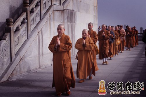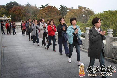 定慧法师以此良机,不舍众生,慈悲开示大众“绕佛”的殊胜法益:绕佛不仅系修学的是养生之道中最殊胜的方法。要晓得生命是精神与物质和合、身心相融的,物质的肉体与精神的灵性,是生命解脱的两大要素。为此,每天虔诚的礼拜佛陀,事实上是心灵清净的必要过程,为此,拜佛时心理必须清净而清除杂念、真诚而充盈虔敬,唯存一句阿弥陀佛为念,心灵的虔敬无染伴之色身的不断起伏礼拜,不仅是一种修学礼敬佛陀的法门,更是得到身心的滋养,四大协调而六根清净。定慧法师的谆谆开示,如甘露般抚慰著众护法居士渴望法雨滋润的心田。嗣后,朝圣团参拜了紫竹林及不肯去观音院。