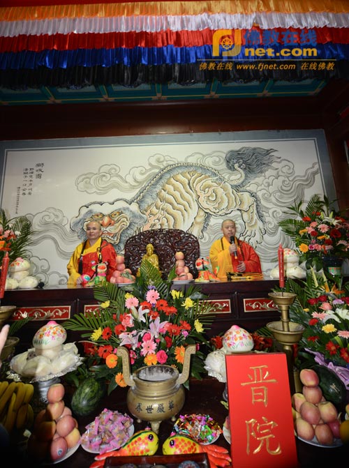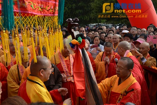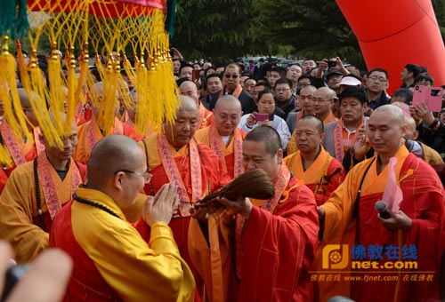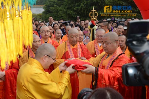 上午8时许,在南山寺山门前,南山寺两序大众排着整齐的队伍,双手合十,在悠扬的法乐声中,虔诚恭请真龙法师拈香说法。接着,养航法师、心保法师、果光法师、宏度法师、长顺法师、性妙法师、大愿法师、果悦法师等分别向真龙法师送祖衣、挂珠、钵、锡杖、拂尘、禅杖、具等。柬埔寨僧王布格里大长老、泰国泰恩法师分别向真龙法师赠送了佛像。