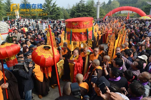 山东龙口南山禅寺隆重举行真龙法师荣膺方丈暨南山大佛开光十周年庆典法会,真龙法师在山门前礼佛说偈
