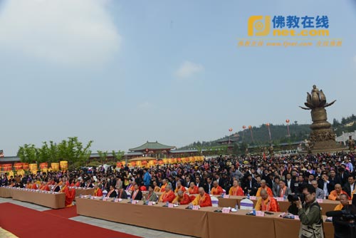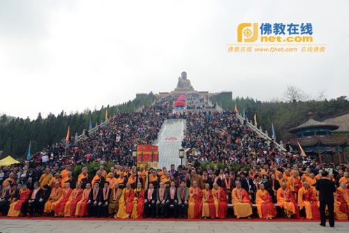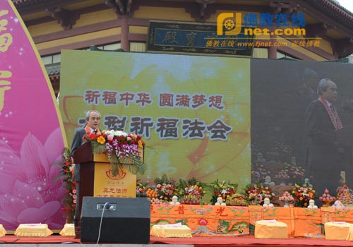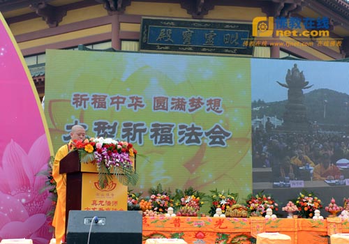升座仪式结束后,在南山华严世界广场举行了以“祈福中华、圆满梦想”的大型祈福法会。南山寺新任方丈真龙法师在法会上致欢迎词。他首先代表南山寺两序大众对前来参加庆典的海内外高僧大德,各级领导和众位居士们表示热烈的欢迎和衷心的感谢!