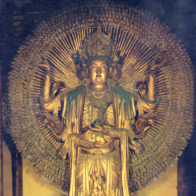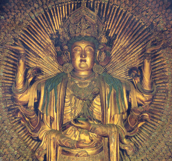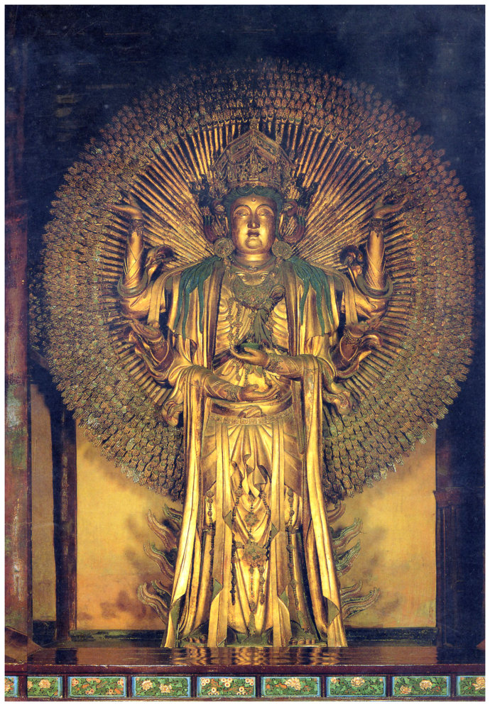 千手千钵千释迦文殊菩萨立像,其身后由无数手臂组成相轮,每只手中都托着一只金钵,每只金钵中都端坐着一尊释迦佛像,而且每尊佛像都精雕细刻,一丝不苟,不愧为我国佛教雕塑艺术的杰作。其塑造年代约在明洪武十六年至二十四年间,距今已有600年历史。像高在8米以上,身后背光美轮美奂,形象高大雄奇,身姿秀美庄严,面相婉丽圆润。从宽阔的前额、慈祥的眉宇、到和善的目光、微笑的神情无不显现着雍容华贵、大慈大悲的神韵。其雕塑风格基本继承了唐代饱满丰硕的风格,同时又具有纤细工丽的时代特色。