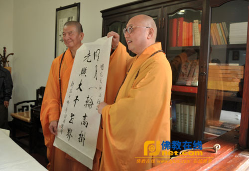随后,在方丈室传实法师与明光法师进行了互动交流。交谈过程中,参访团成员共品大佛龙井,互相交流了佛茶文化。交谈之余,传实法师向明光法师赠送了新昌大佛龙井新茶,还互献墨宝,共同完成“明月一轮高挂,光照大千世界”对联,以作留念。