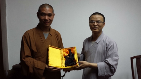 下午6点,普耀法师邀请朝圣团法师及学员们在空林用斋。临行前,普耀法师代表空林佛学院向了静法师赠送乌木观世音菩萨像,希望朝圣团不虚此行,欢喜而归。