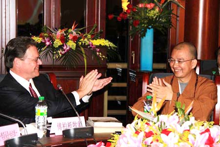 10月19日下午5时,美国宗教联合代表团一行,在国家宗教事务局郭伟司长及中佛协蘧俊忠副秘书长、陈文尧副秘书长等的陪同下,来到北京龙泉寺参访,受到寺里僧俗二众的热情接待。中国佛教协会副会长兼秘书长学诚大和尚亲自在山门口迎接美国客人,双方在见行堂的明心阁进行了亲切友好的座谈。