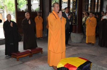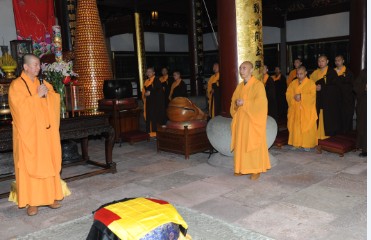 上午11时左右,参访团乘坐的大巴抵达寺院山门口,界义法师率众执事在门外迎候。在界义法师等的陪同下,明光大和尚一行先到圆通宝殿与常住四众会面。欢迎仪式上,两序齐唱“香赞”、大众集体礼佛后,监院定光法师首先致辞,欢迎明光大和尚一行到七塔禅寺参访,希望大家此行能有满意的参学收获。随后,明光大和尚为大众开示,对七塔禅寺常住四众的热情接待表示感谢!称此次大陆之行,是依循前世界佛教僧伽总会会长、台湾“中国佛教会”理事长悟明长老(1911—2011)的出生、出家、受戒、参学、弘法度生的足迹来寻根溯源,以此缅怀悟公之恩德!老和尚生前曾交待弟子,七塔禅寺是观音道场,号称“小普陀”,是朝拜普陀山的必到之地。因此,明光大和尚此前就曾来此参访过,此次又特意率团再来,感觉因缘非常殊胜!