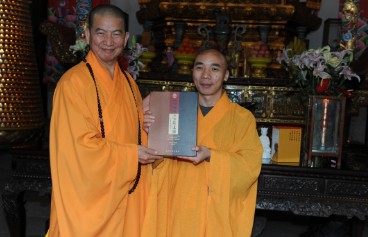 欢迎仪式后,界义法师引领客人们参观了七塔禅寺各主要殿堂,逐殿作了简要介绍;最后在三德堂餐厅设素宴,款待明光大和尚一行。