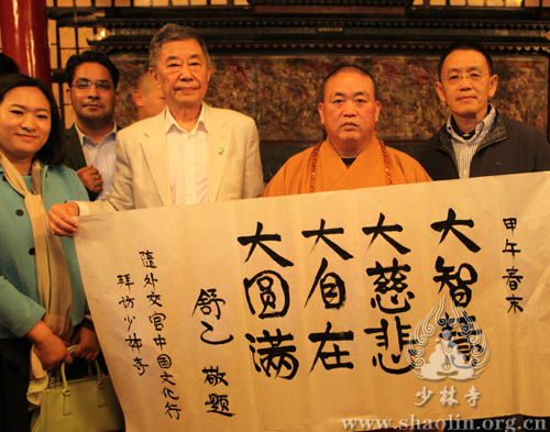 2014年4月26日下午,由中国公共外交协会举办的“驻华外交官中国文化行”活动代表团一行,在中国公共外交协会副会长舒乙的带领下参访少林寺,受到少林寺方丈永信法师及僧众的热烈欢迎。来自新加坡、意大利、西班牙、阿富汗、伊朗、瑞士、秘鲁等十七个国家的驻华大使、驻华公使、驻华参赞和外交官,兴致勃勃地参观了少林寺常住院,了解了厚重博大的少林文化。河南省、市领导陪同参观。