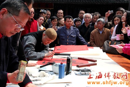 消息传来,信众欢呼。一会儿功夫,书法现场就排满了献爱心的香客信众。大家踊跃捐款,奉献爱心。龙华古寺法师、信众、职工、义工踊跃参与,书画台前很快就排起了长龙。很多善信男女来寺进香,既能为生命之源窖井工程献爱心,又看到照诚大和尚亲笔题字,非常热心,现场爱心涌动,情意满满。