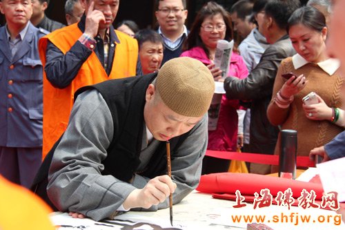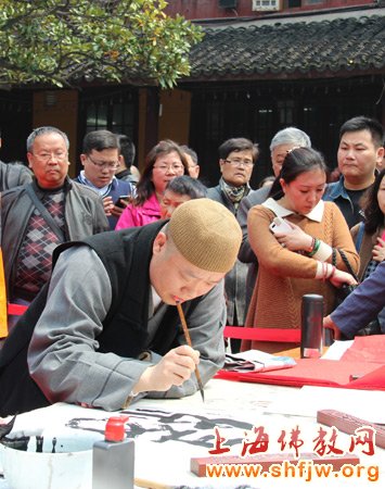 龙华古寺方丈照诚大和尚善心涌动,于龙华古寺大雄宝殿前设书画摊,现场书法,为甘肃生命之源“甘露工程”人饮水窖工程募款。