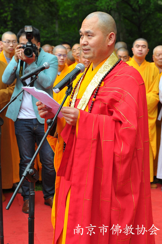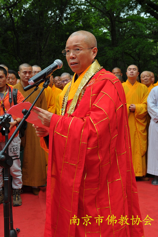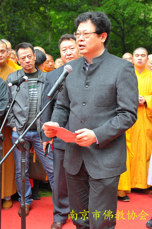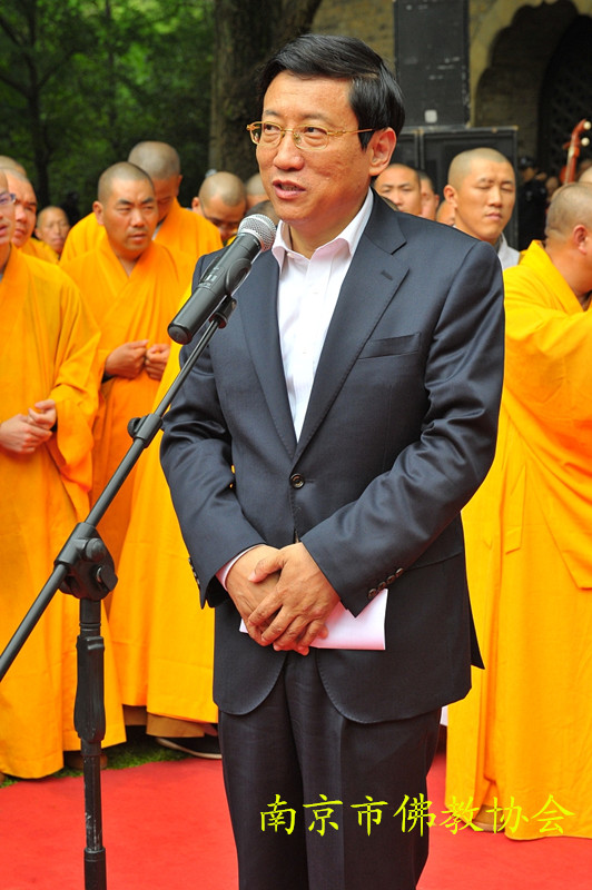 南京市人民政府陈刚副市长代表南京市政府对参加此次活动的各位领导、高僧大德、各界人士表示了诚挚欢迎和衷心感谢,介绍了南京佛教的发展情况,希望南京佛教界以市委市政府打造现代化国际人文绿都、世界历史文化名城和举办青奥会为契机,进一步发掘整理南京优秀佛教文化,展现金陵魅力。
