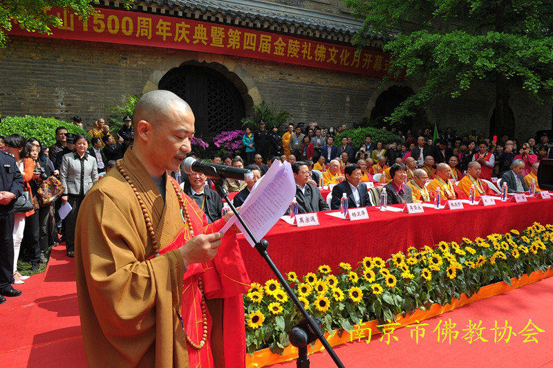 4月28日上午,灵谷寺开山1500周年庆典暨第四届金陵礼佛文化月开幕式在紫金山灵谷公园无梁殿前隆重举行。国家宗教事务局副局长蒋坚永、江苏省政协主席张连珍、江苏省委常委、南京市委书记杨卫泽、江苏省委统战部副部长、江苏省宗教事务局局长莫宗通、江苏省人大民族宗教侨务委员会主任邵军、江苏省政协社会法制(民族宗教)委员会主任邵建东、江苏省宗教事务局副局长王在郑、南京市委常委、市委秘书长项雪龙、南京市委常委、市委宣传部部长徐宁、南京市委常委、市委统战部部长李世贵、南京市人大常委会副主任单景南、南京市人民政府副市长陈刚、南京市政协副主席陆平贵等领导出席活动。中国佛教协会咨议委员会副主席明学长老、松纯长老、中国佛教协会副会长心澄法师、纯一法师、副秘书长宗家顺、教务部主任宏度法师、新加坡佛教会副会长法喜法师、江苏省佛教协会副会长兼秘书长秋爽法师、北京市佛教协会副会长怡学法师、兰州市佛协会长理因法师、滁州市佛协会长顶光法师、江苏省佛教协会副会长隆相法师、能修法师、传义法师、普仁法师、果光法师、吴国平、俊才法师、昌鉴法师、了尘法师、曙正法师、莲华法师及佛教界人士、僧俗信众近1千人参加盛会。