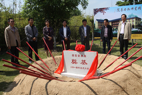 启动仪式后,出席同觉寺首届两岸三地素食文化交流周的领导和居士一起为同觉寺佛教安养院奠基培土。崇恩寺住持计华大和尚、圣像寺妙法大和尚和同觉寺方丈曙提法师一起为安养院建设用地洒净加持。